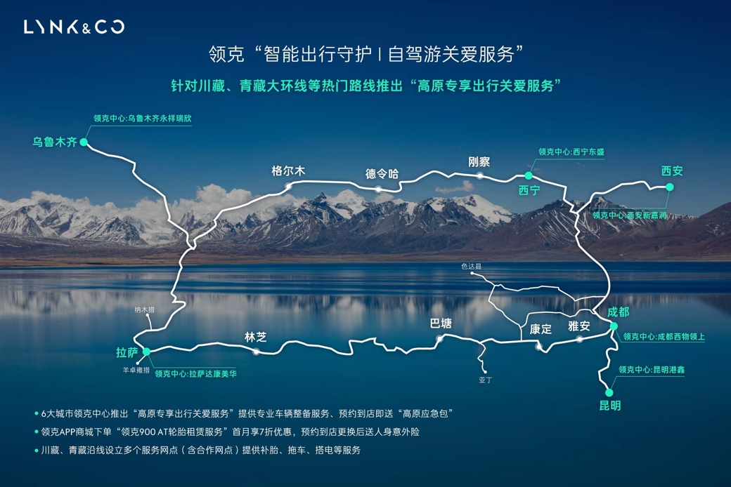 领克于新疆、西藏热门自驾路线周边6个主要城市,开放了6家领克中心,专门针对有高原出行需求的用户提供更专业的车辆整备服务,用户提前预约,到店即送“高原应急包”。同时,用户可通过领克APP服务商城下单“领克900 AT轮胎租赁服务”(须提前10个工作日预约安装),首月享受七折优惠,预约到店更换后即可获赠人身意外险一份。