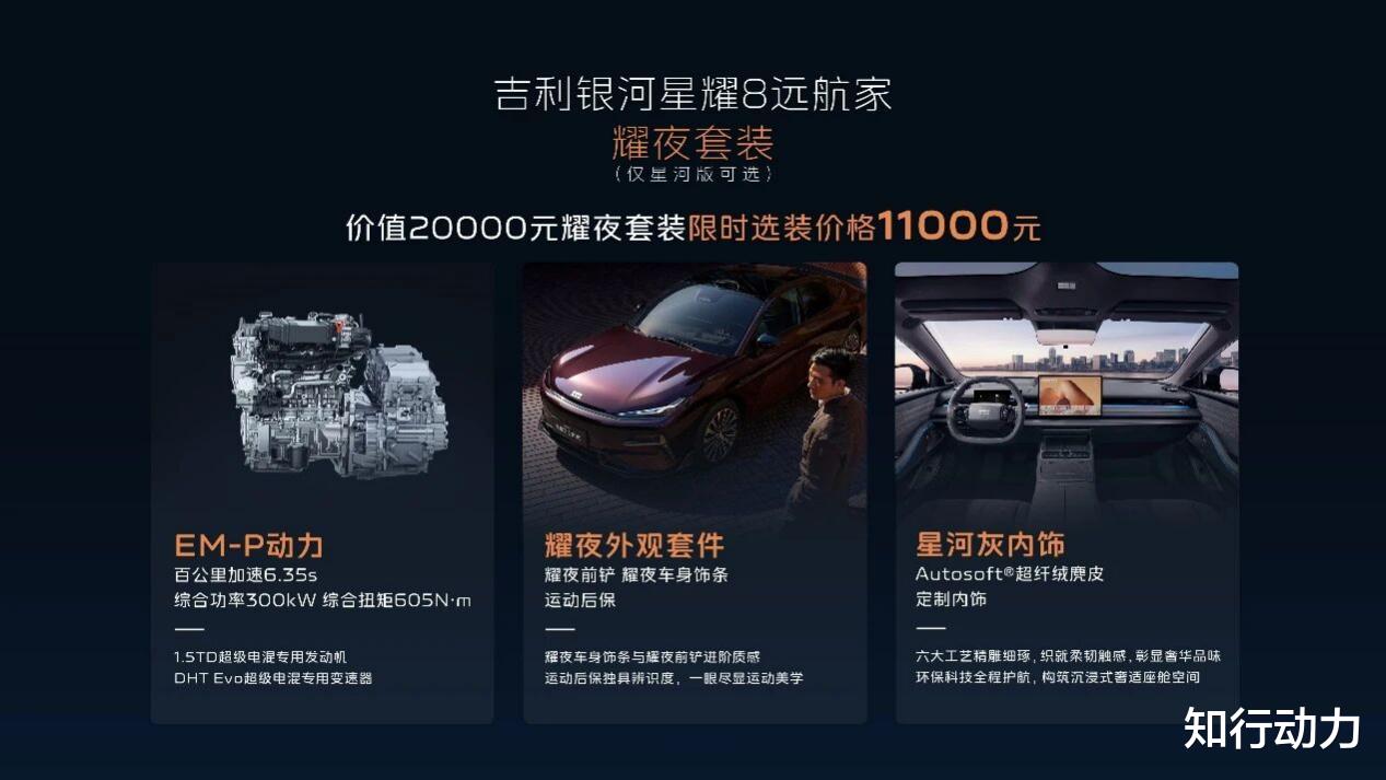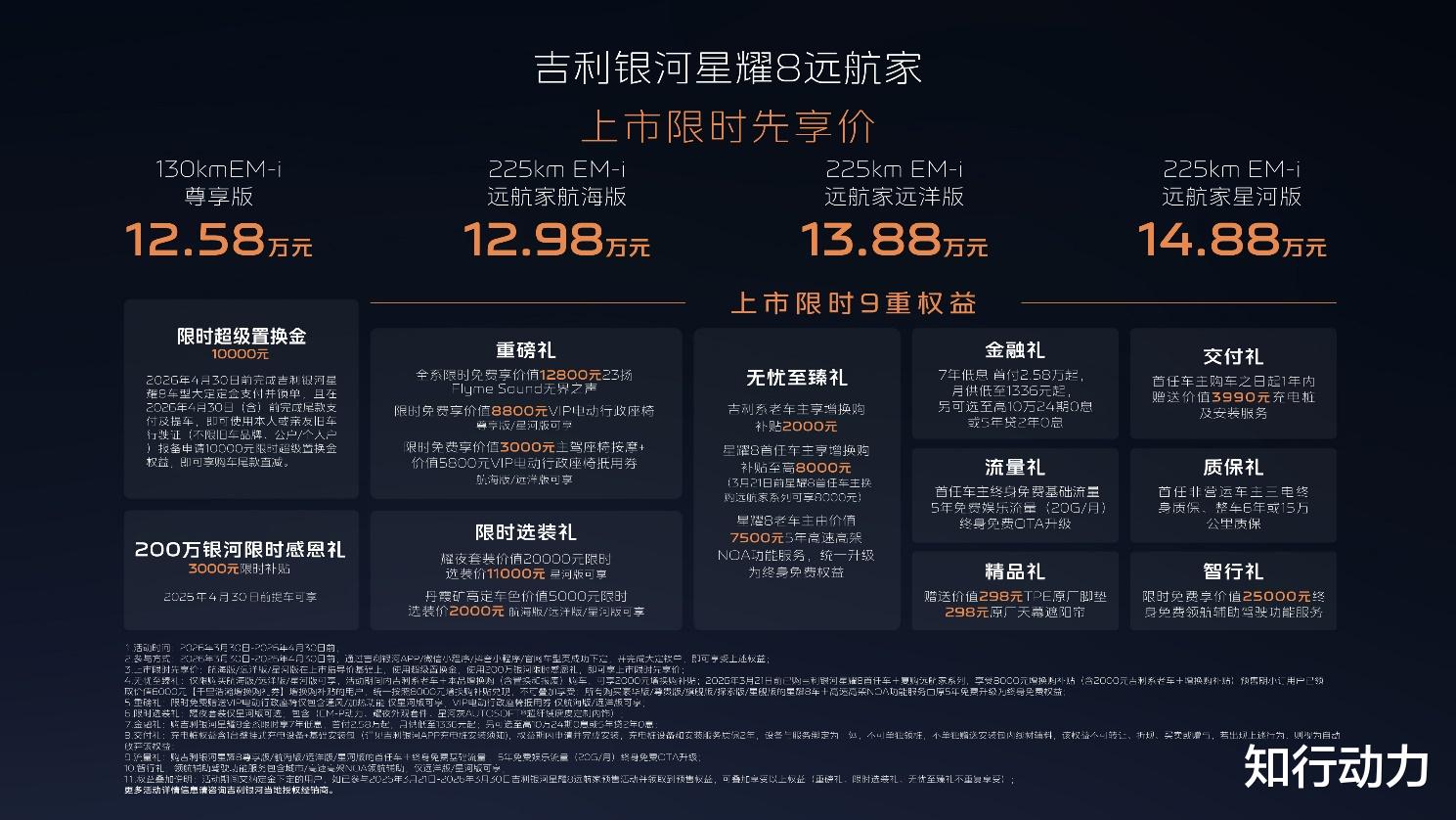 3月30日,吉利银河星耀8远航家系列正式上市,共推出4款车型,指导价为14.28-17.28万元,限时先享价为12.58-14.88万元。