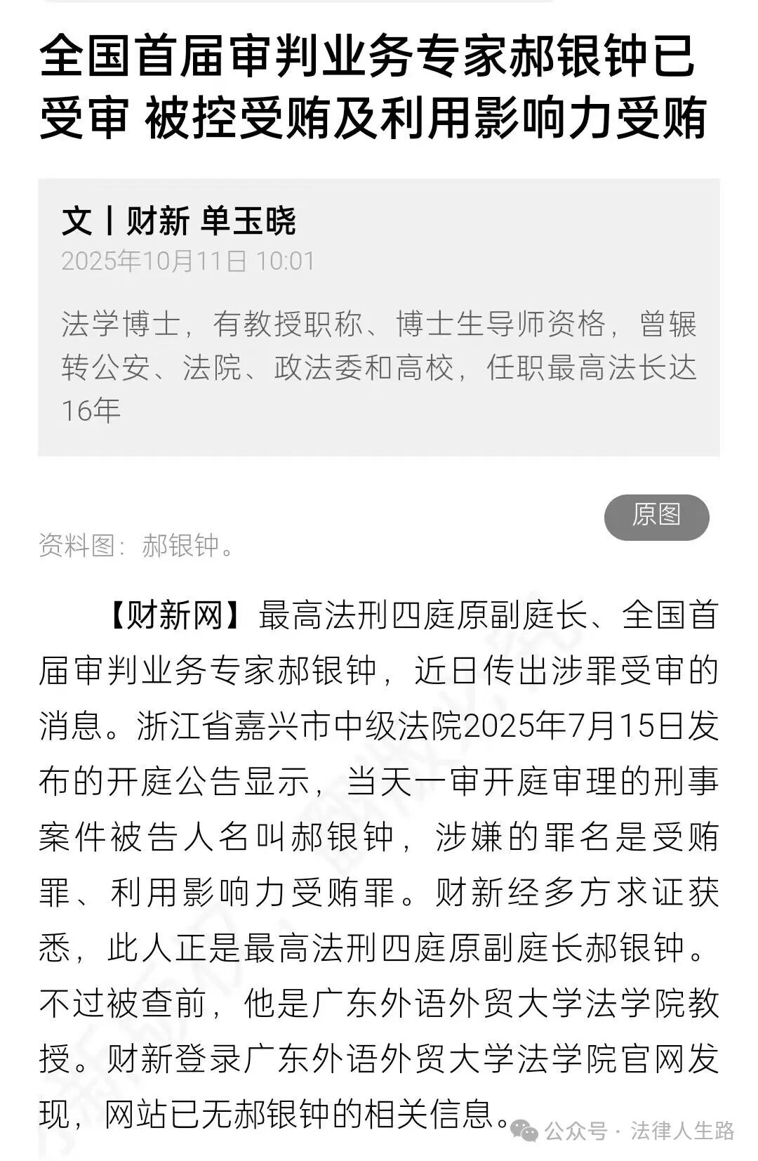 最高法刑四庭原副庭长、全国首届审判业务专家郝银钟,因涉嫌受贿罪、利用影响力受贿罪,于 2025 年 7 月 15 日由浙江省嘉兴市中级法院一审开庭审理。