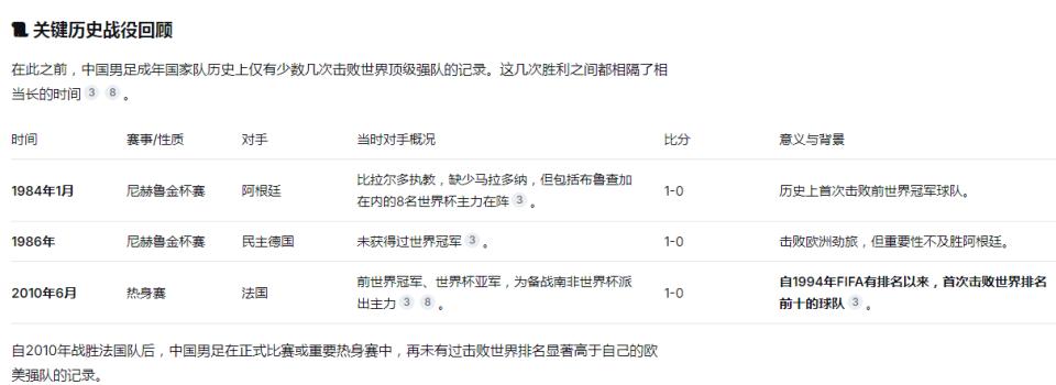 最近一次成年队对远高对手胜利是2010年6月4日1-0法国(法国排名第9,中国第84,差75位)。这是中国足球史上最经典“爆冷”之一。那场球中国男足凭借邓卓翔任意球绝杀,帮助中国队1-0取胜。