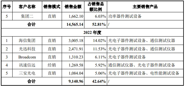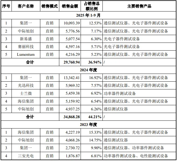 招股书显示,报告期内,联讯仪器对前五大客户实现营业收入分别为9140.96万元、1.46亿元、3.49亿元、2.98亿元,占当期营业收入的比重分别为42.64%、52.81%、44.21%和36.94%,集中度相对较高。