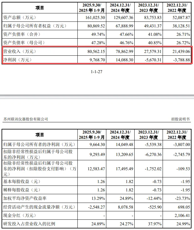 财务数据显示,2022年至2025年前三季度,联讯仪器实现营业收入2.14亿元、2.76亿元、7.89亿元、8.06亿元;净利润为-3788.88万元、-5670.31万元、1.41亿元、9768.70万元。
