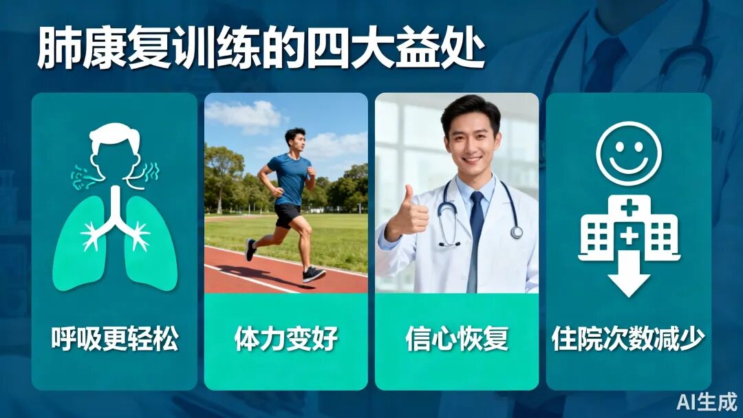 住院次数少了,省钱了:坚持肺康复训练可以减少发作,既维护了健康,又减轻了经济负担。