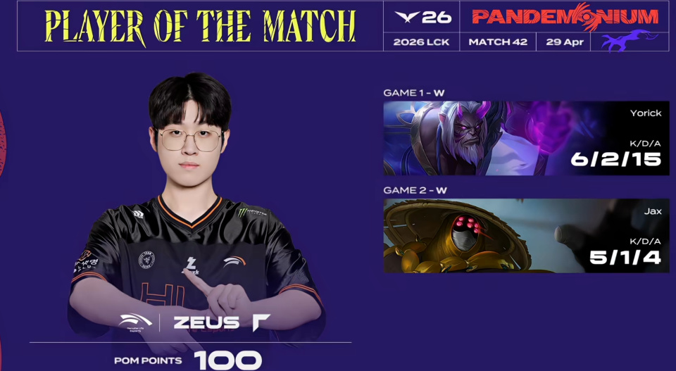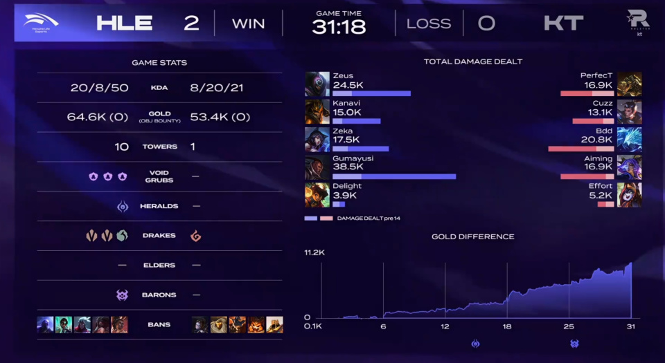 从这个BO3打下来,感觉两支队伍都不是一个级别的,不知道是不是队伍之间的一种克制!KT的打法其实主要靠Cuzz在前期指挥方面,也靠他的节奏带动队伍,往往能够在前期拿到很大的优势,拿到优势在稳着去打之后的优势团获胜!但是HLE这边,Kanavi把这种节奏完全给反转过来了,前中期把压力全给到KT的下路,拿到大优势滚雪球!Zeus这边面对Perfect,两把都完成压制,并获得对位POG!