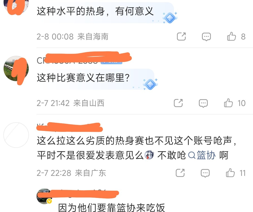 大部分是对于热身赛强度的质疑,认为这样的比赛确实没有意义,如果单从运动员适应比赛节奏来看,确实需要从弱到强。但也不能太弱了,还不如找WCBA的球队来试试呢,反正前几天都在打杯赛,忙里偷闲就打了,强度绝对要比国际联队大的多。