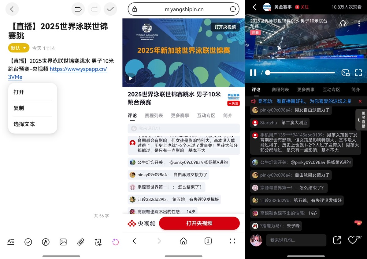 作为央视频的老用户,必须得体验下鸿蒙版央视频。用华为账号一键登录后,秒进推荐页,世运会专题里边还有专门的赛事赛程,最贴心的是能预约比赛直播,根本不用担心错过。更让人惊喜的是统一链接跳转功能,之前在群里看到朋友发的央视频泳联世锦赛直播链接,点击链接后就能快速直达鸿蒙版央视频直播间,整个过程丝滑得不像话。