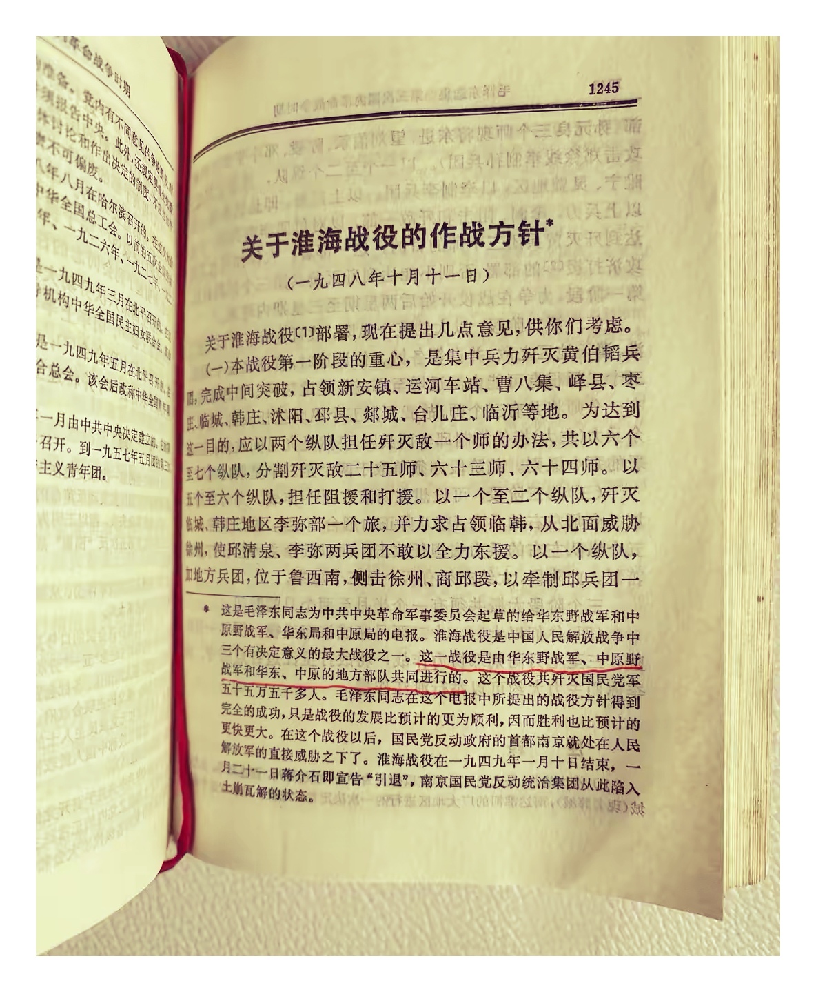 3.《毛泽东选集》1969年版的第4卷中关于淮海战役的注释。这是对毛泽东《关于淮海战役的作战方针》一文的四个注释之一,介绍淮海战役的概况。《关于淮海战役的作战方针》一文,即为毛泽东1948年10月11日的《中央军委关于淮海战役部署致饶漱石、粟裕、谭震林等电》(该电并告华东局、中原局)。收入《毛泽东选集》第4卷时,作了部分删节和一些纯文字的修改,题为《关于淮海战役的作战方针》。