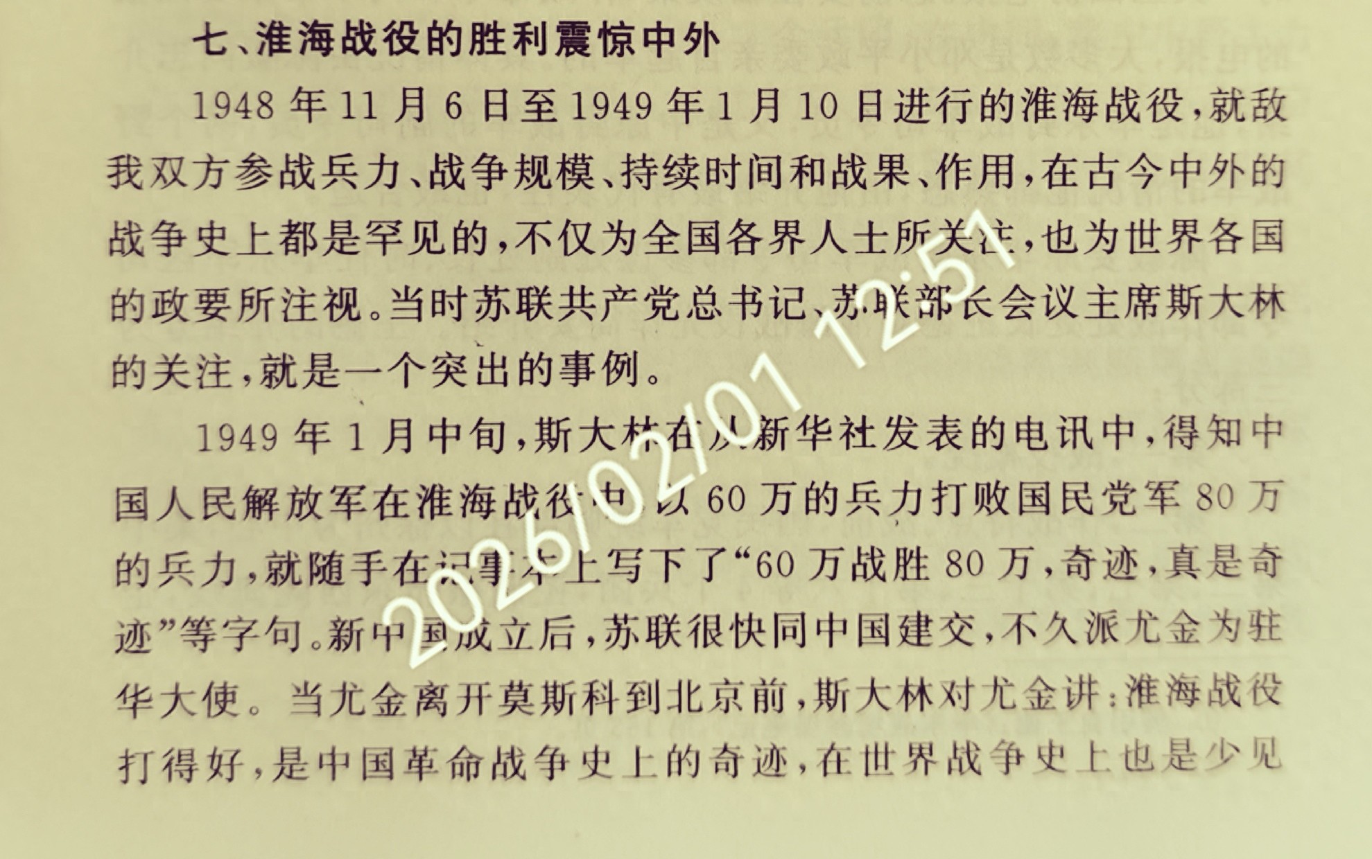 1948年11月6日至1949年1月10日进行的淮海战役,就敌我双方参战兵力、战争规模、持续时间和战果、作用,在古今中外的战争史上都是罕见的,不仅为全国各界人士所关注,也为世界各国的政要所注视。当时苏联共产党总书记、苏联部长会议主席斯大林的关注,就是一个突出的事例。