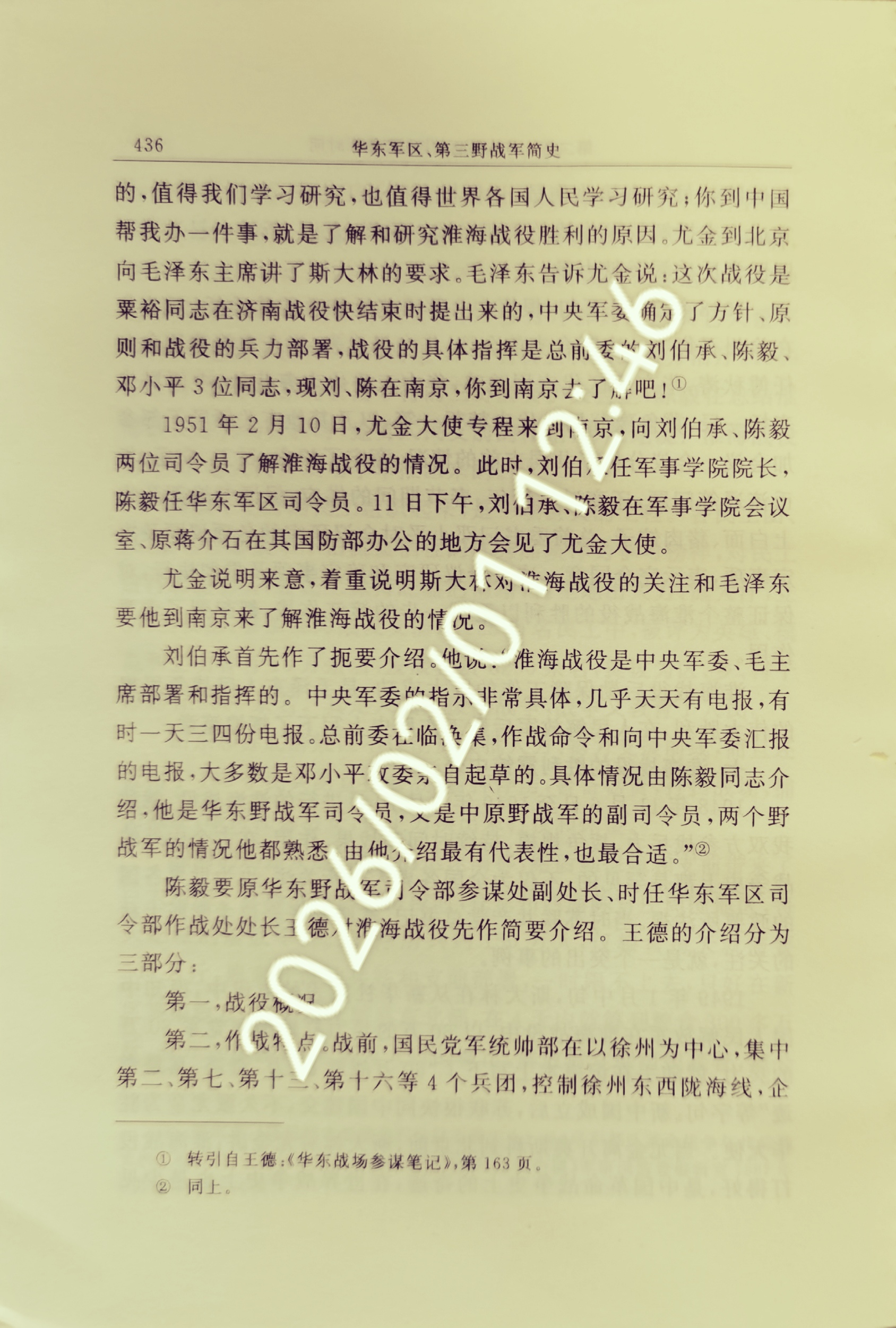 2.1951年1-2月,苏联驻华大使尤金受斯大林的委托,来华全面了解淮海战役情况。这一事件在《华东军区、第三野战军简史》(王辅一著,中央党史出版社出版,2002年7月第1版)中有详细记述。《华东军区、第三野战军简史》的记述中,很多史料引自当事人之一的王德著的《华东战场参谋笔记》(上海文艺出版社出版,1996年7月第1版)一书。