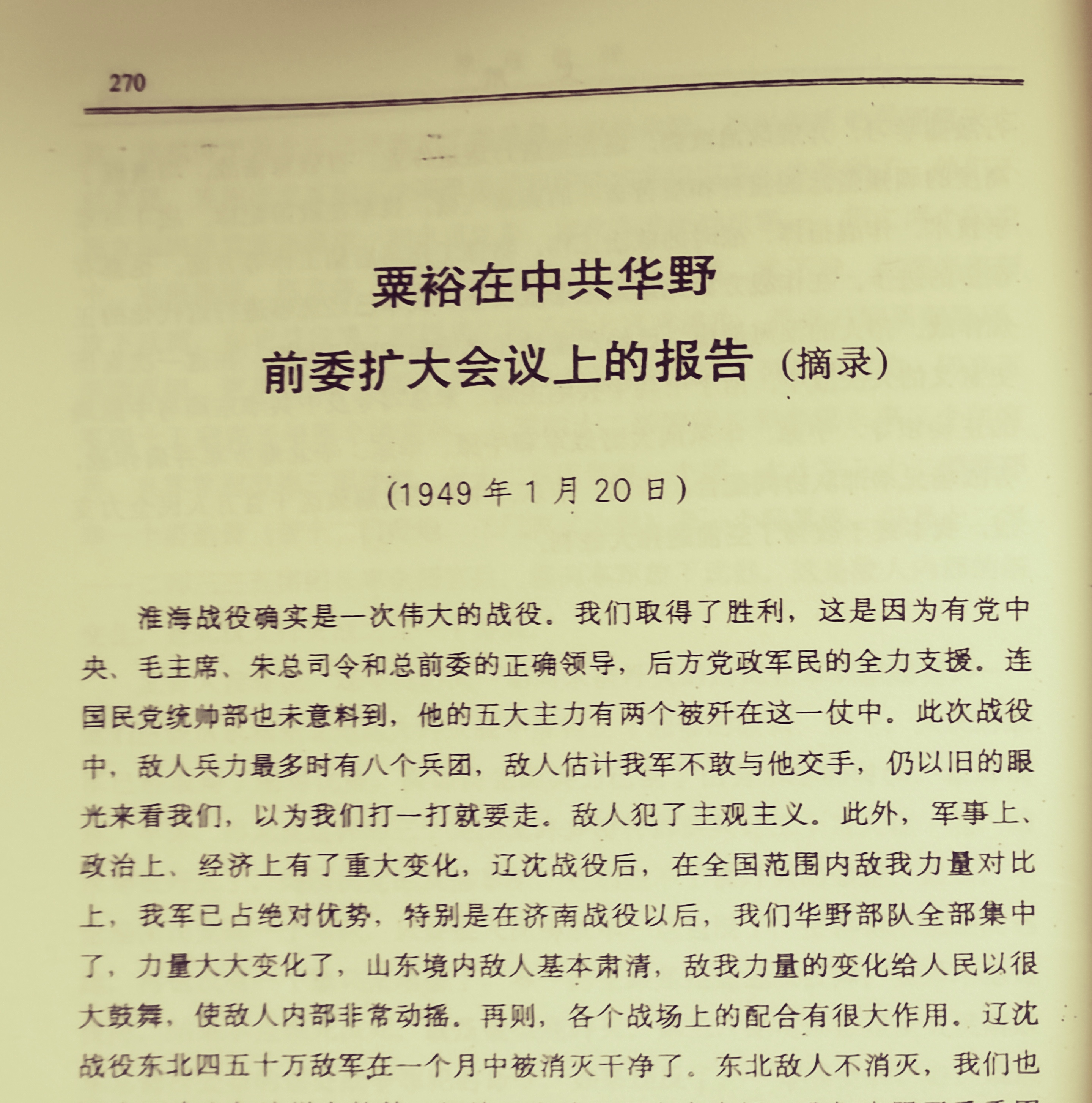 4.粟裕大将,在华野总前委1948年1月20日的会议上讲话时说道:“淮海战役确实是一次伟大的战役。我们取得了胜利,这是因为有党中央、毛主席、朱总司令和总前委的正确领导,后方党政军民的全力支援。”晚年也曾经说过,淮海战役是他指挥的。