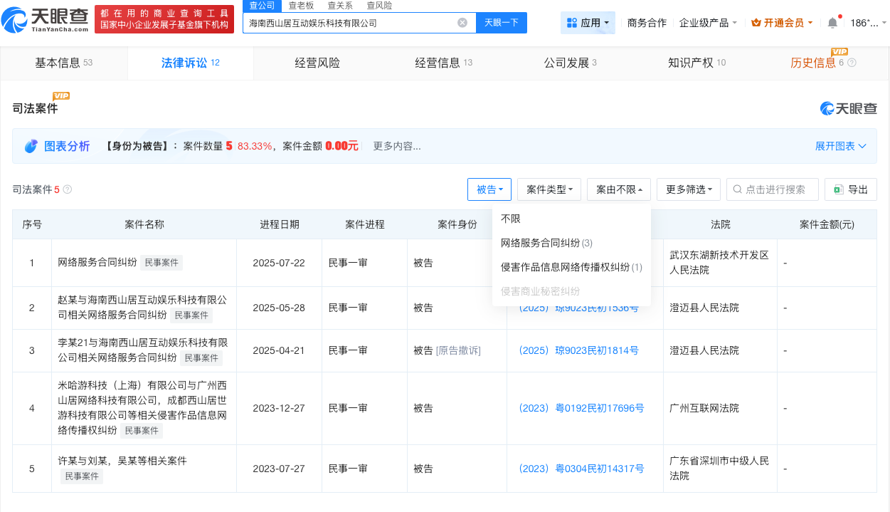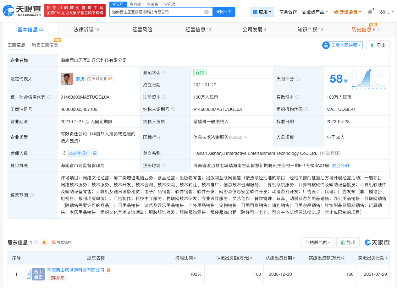 天眼查App显示,尘白禁区运营方海南西山居互动娱乐科技有限公司成立于2021年1月,法定代表人为邹涛,注册资本100万人民币,经营范围包括网络文化经营、第二类增值电信业务、食品经营、出版物零售、出版物互联网销售等,由珠海西山居世游科技有限公司全资持股。法律诉讼信息显示,该公司曾因网络服务合同纠纷、侵害作品信息网络传播权纠纷被起诉。
