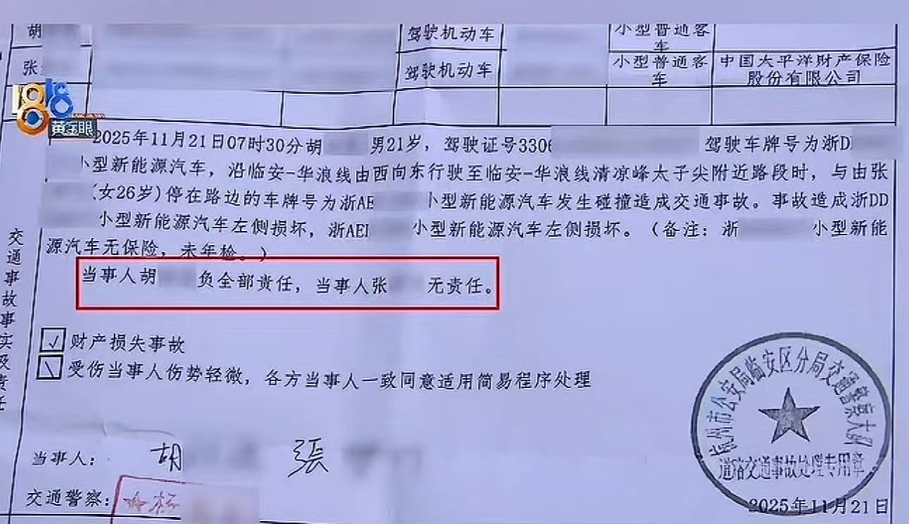 “开车睡觉、无保险、未年检,还有这么多违章,这简直是马路上的‘定时炸弹’啊!” 张女士又气又怕,交警当场开具责任认定书,认定小胡负全部责任。