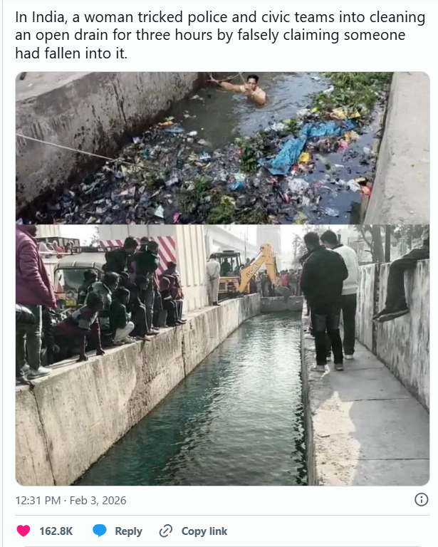 2026年2月,印度北方邦密鲁特,一名女性因社区排水沟长期堵塞、多次投诉无果,选择以谎报儿童失踪的方式,成功引来警方和市政部门出动,将堵塞已久的排水沟彻底清通。