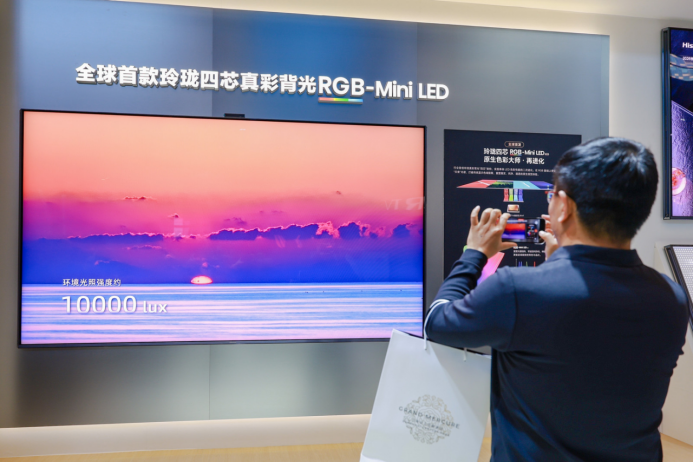然而,日韩企业不得不直面的现实是,当他们还在努力打磨第一代RGB-Mini LED技术,海信已经率先完成了技术的全方位迭代。AWE展会期间,海信UX2026款最受关注的核心亮点,无疑是其搭载的全球首创玲珑4芯真彩背光技术。这项技术直击行业“色彩受限、光晕难消、还原不准、久用褪色”四大痛点,在红绿蓝三原色芯片之外突破性加入天青色发光芯片,精准填平了行业多年无解的480-520纳米“青色断层”,实现110% BT.2020全程亮彩稳定高色域,在常规10.7亿色基础上,额外解锁1.2亿种传统屏幕无法合成的极限色彩。配合43008个控色分区与10000nits真彩亮度,实现了“1区控色>3区控光”的颠覆式突破,从根源上解决了普通Mini LED串色、色晕、偏色的行业顽疾。