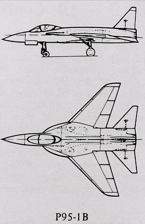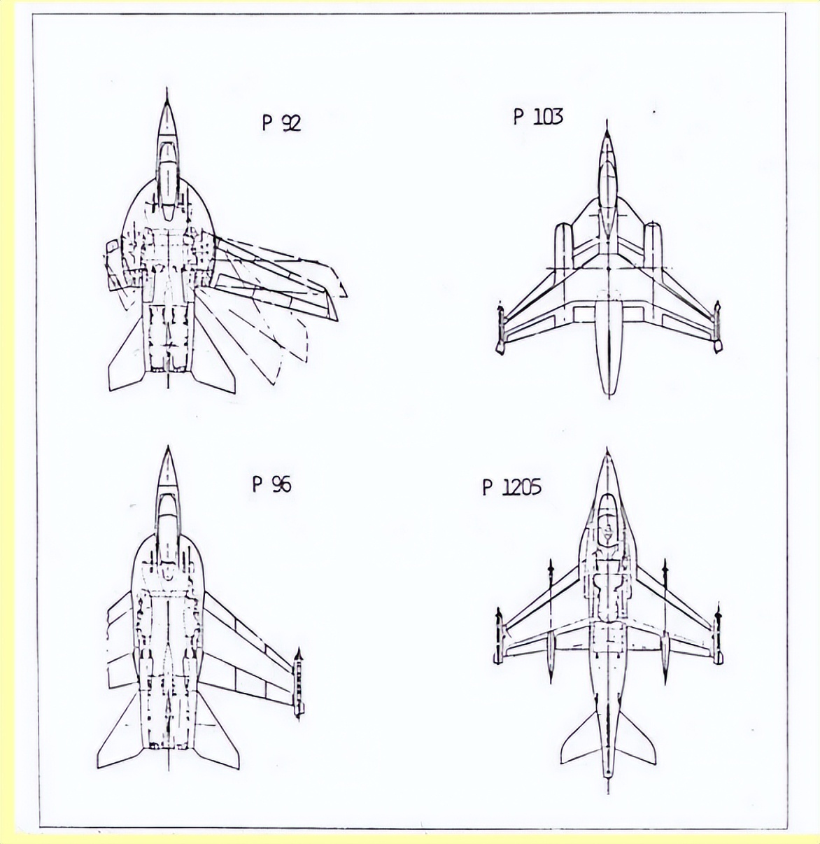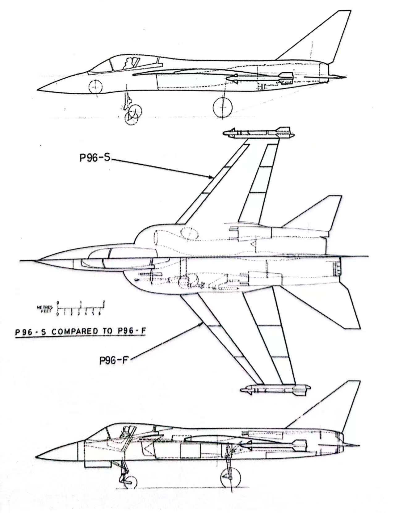 P.96F 是该项目的最后阶段,比早期提案略大,是一款相对经典的双引擎飞机。采用明显后掠的高位机翼的,尖端安装有短程空对空导弹挂架。机翼根部的大圆边条,应该可以提高低速大迎角时的机动性并减少起飞和降落长度。