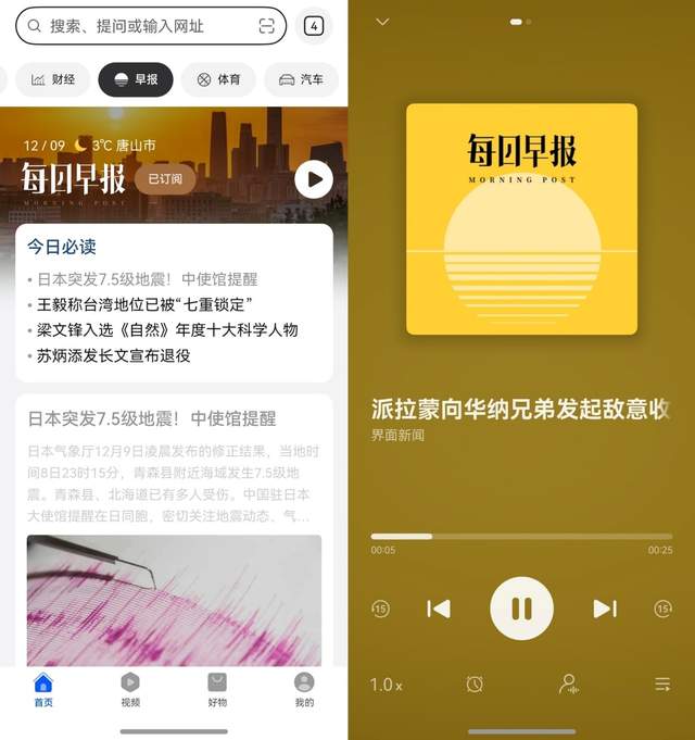 除了深度阅读“视界”,华为浏览器的“每日早报”则是我追热点时事的利器。点一下“听新闻”,真人感语音播报侃侃道来,重点资讯一个不落。也不用时刻盯着屏幕,日常利用碎片时间就能知晓天下事,新鲜感拉满。