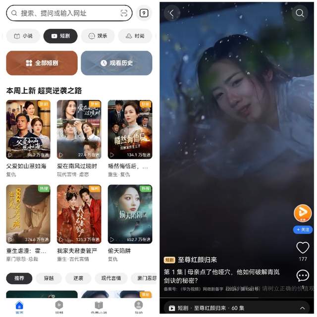 除了日常工作找材料和学习查资讯之外,华为浏览器也是我的“娱乐搭子”。“小说”频道和“短剧”频道,内容丰富,超级上头。午休或者晚饭后,我会去“短剧”频道刷几集解压。这几天沉迷刷《至尊红颜归来》,女主从跌落谷底逆袭成执掌全局的女王,脚踹反派、事业开挂,隐忍与霸气的反差感直接戳中爽点。全集随心跳转,爽感直接拉满。
