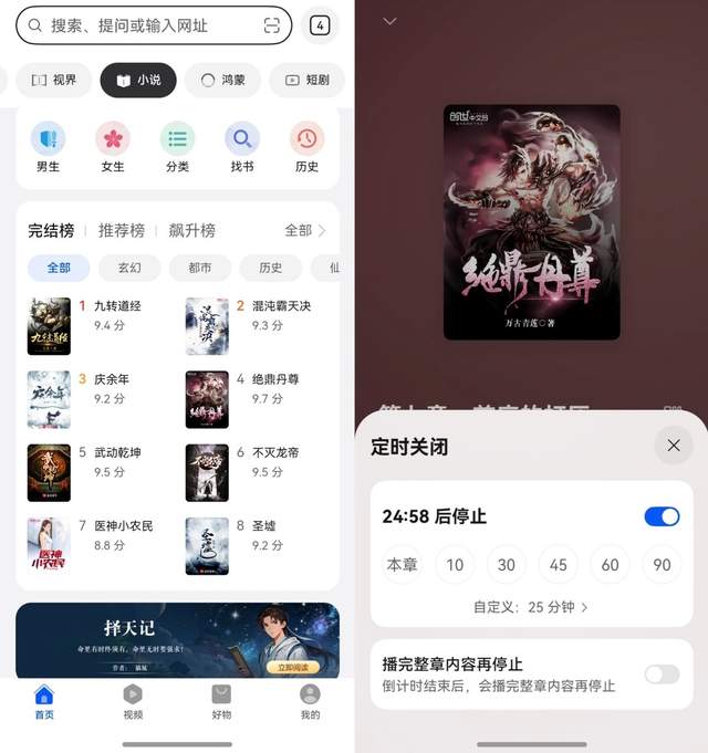 睡前,我通常会打开“小说”频道追更,每本小说都能打开“听小说”模式,设个25分钟定时关闭,近8款丰富音色选择,沉浸式代入剧情,听着听着就睡着了,非常完美的入睡搭子。