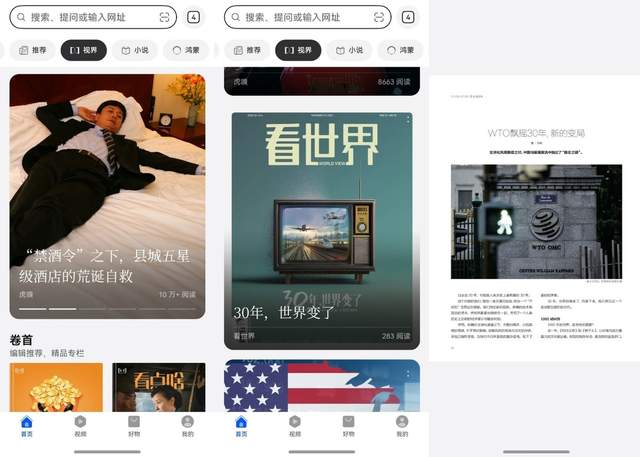 而且浏览体验感极佳,接近实体杂志比例的4:5大图设计,文字排版舒适,配图精美。指尖轻滑便可切换文章,那种丝滑的浏览体验,真的让看资讯成了一种享受。我现在每天都会在“视界”里待上半个小时,科技、财经、人文类最新资讯随心看,既长了见识,又能满足一整天的求知欲。