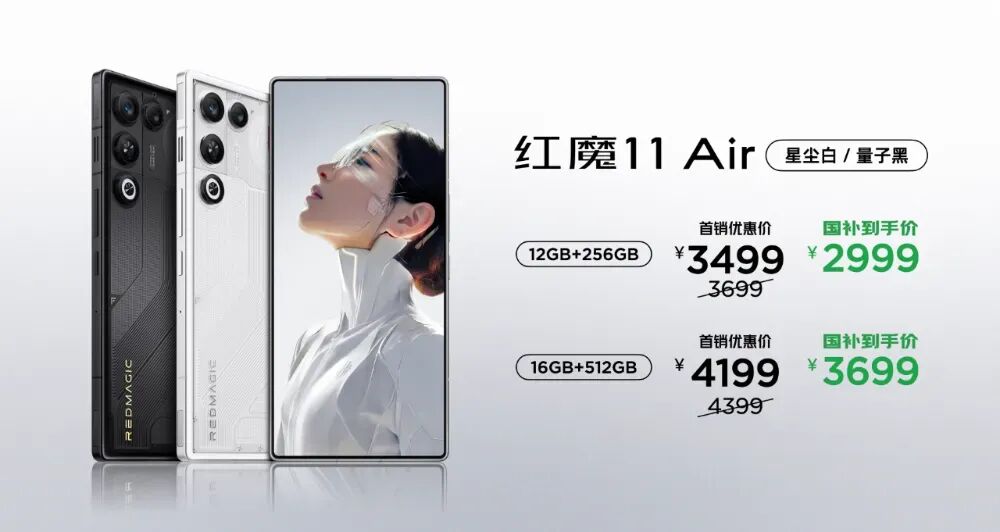 红魔 11 Air,12GB + 256GB版本3699 元,首发价 3499 元;16GB + 512GB版本4399 元,首发价 4199 元。可叠加国补。