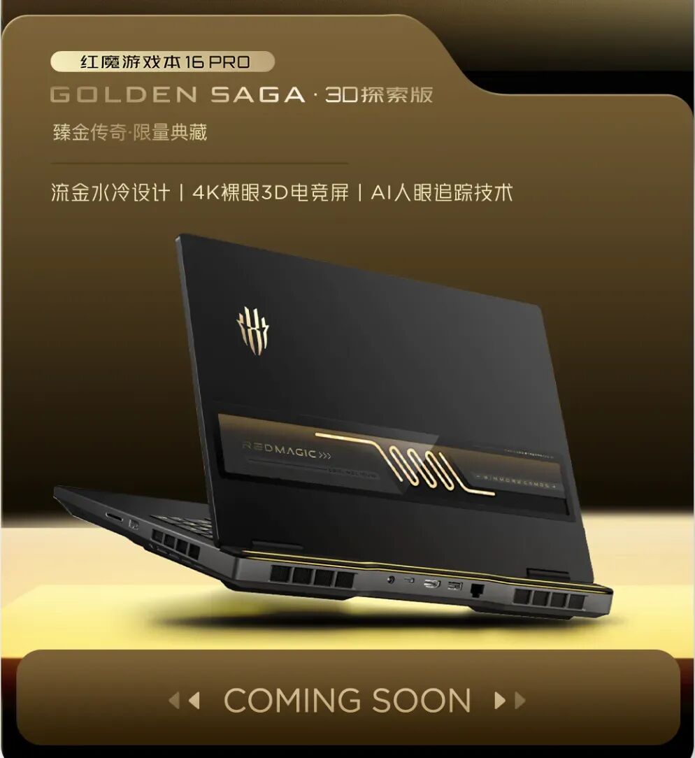 另外还有红魔游戏本16Pro臻金传奇3D探索版。流金水冷设计,4K裸眼3D电竞屏,AI人眼追踪技术。