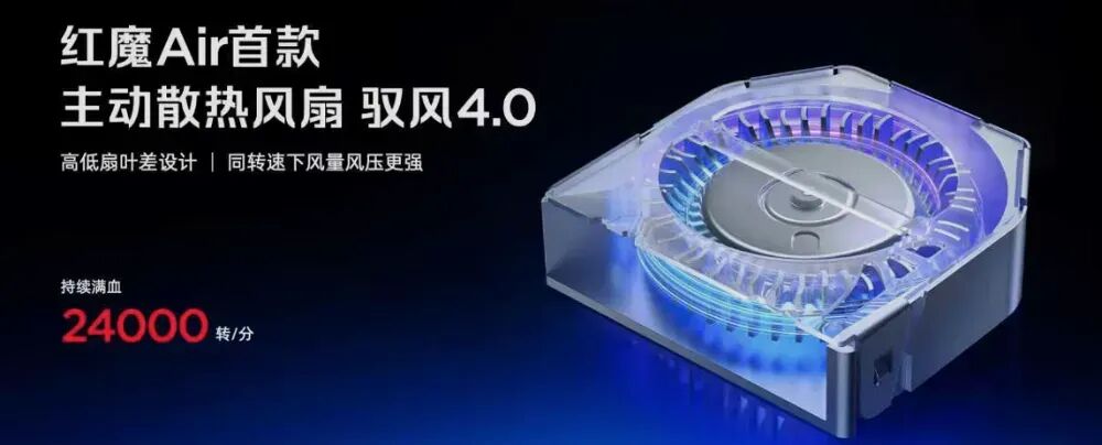 红魔Air首款主动散热风扇驭风4.0,转速24000r/min。还有行业首款超厚冰阶VC,行业首创双面凸起设计,红魔首创超高密度毛细回流方案。