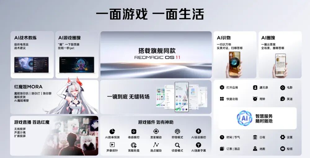 运行旗舰同款REDMAGIC OS 11.0,支持AI识物、AI圈搜、AI战术教练。