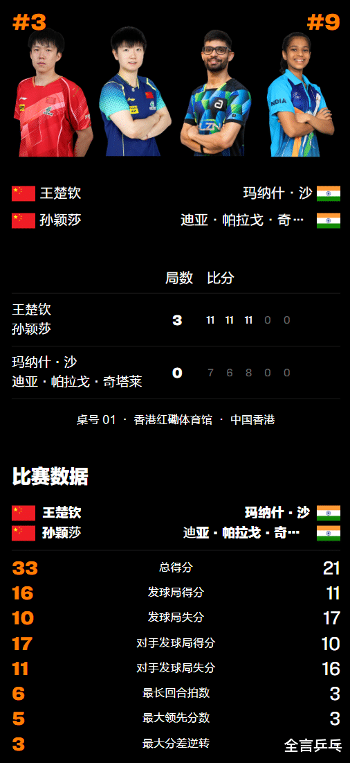 北京时间2025年12月10日下午,国乒迎来WTT香港总决赛的混双首战,备受关注的“莎头”组合问登场,迎战印度的玛纳什/奇塔莱,结果王楚钦/孙颖莎3-0轻松结束战斗,由此而率先在混双第1组的循环赛较量中取得胜利,详细战况请看下文。