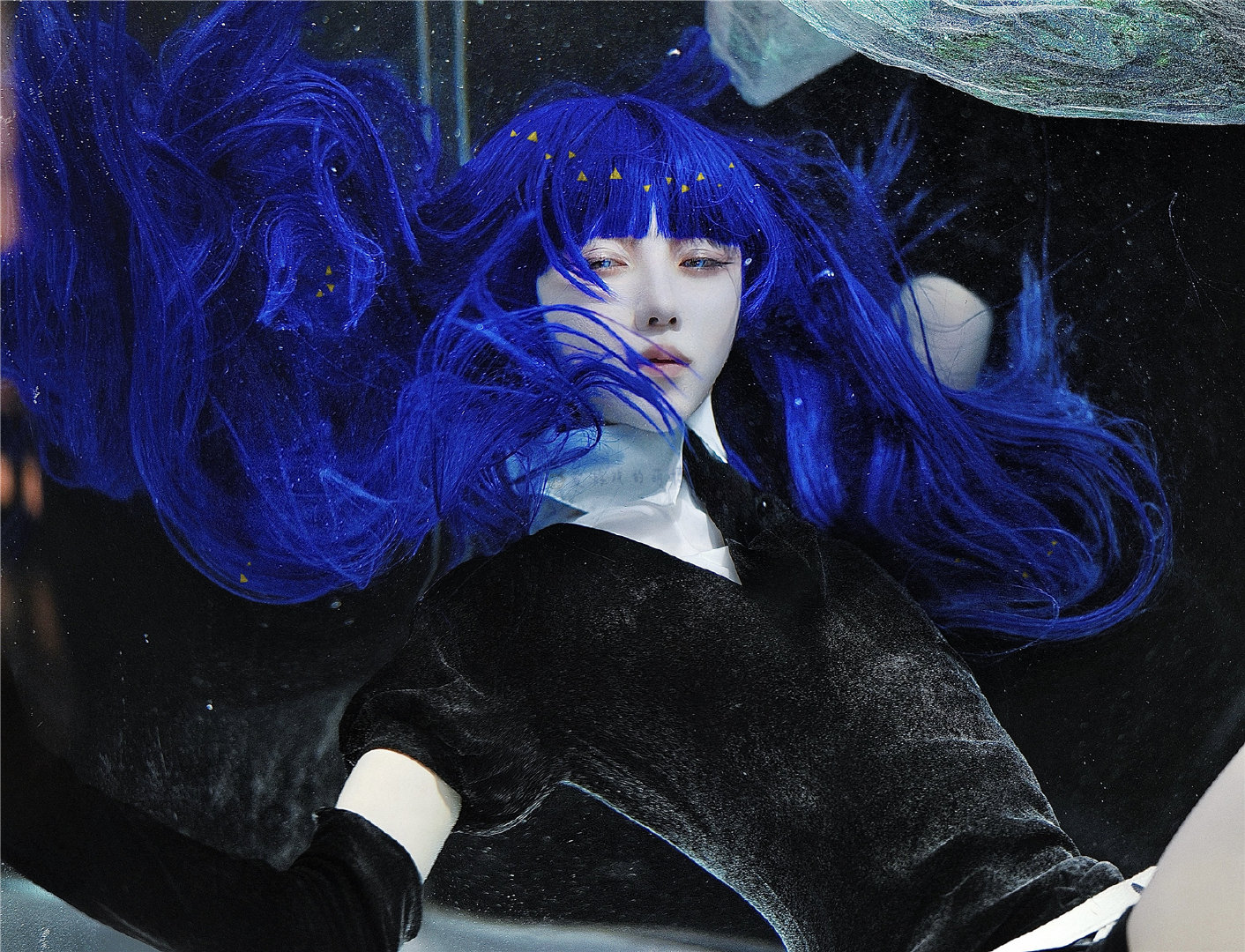 在《宝石之国》世界观里,地球上仅剩下28个拥有宝石之身的人形生命体,其中就有“青金石”。青金石以端庄典雅的蓝色为主色调,整体风格华丽而富有神秘感,动漫里也是类似的形象。“ハテ”就把自己打扮成了青金石,不过与平时不一样,她这一次选择沉进一个大型水槽进行拍摄,感觉和效果一下子就变了!