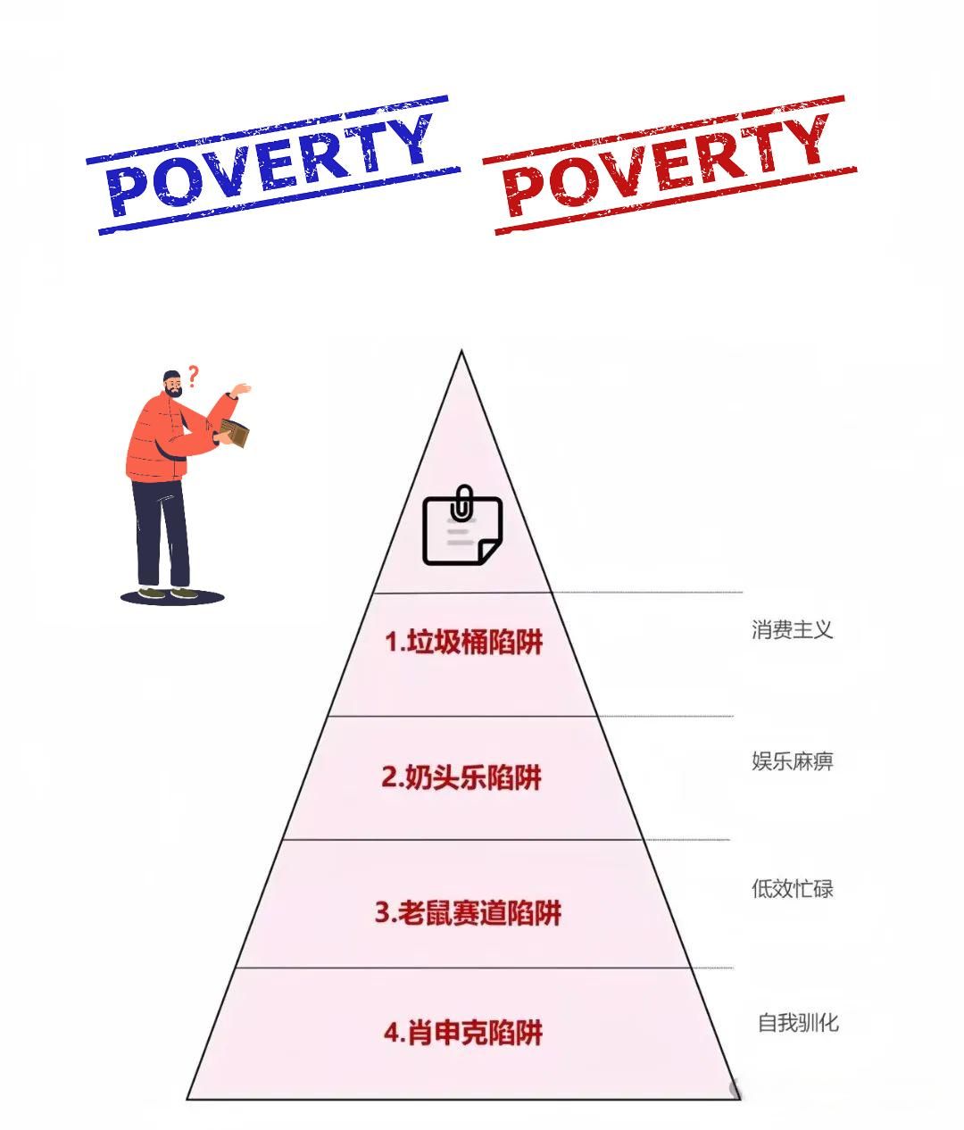 大家好呀!今天想和大家分享一张非常有意义的图片,它把我们带入对“贫困”的深层次思考中。图片中的“POVERTY”两处被蓝色和红色印章覆盖,仿佛在提醒我们贫困的沉重现实。而图片中的内容则揭示了导致贫困的四个陷阱。