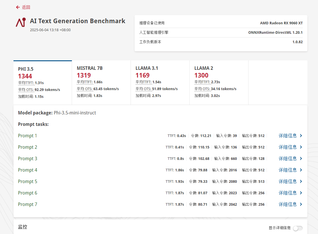 AI应用方面,很多时候“显存大小即正义”。更大的显存不但意味着更高的AI性能,甚至有些模型在小显存卡上无法运行。比如在Procyon AI文字生成测试中,拥有16GB显存的RX 9060 XT可以完成四种模型的测试,并且取得不错的成绩。而只有8GB显存的显卡在LLAMA 2模型中直接溢出无法运行。