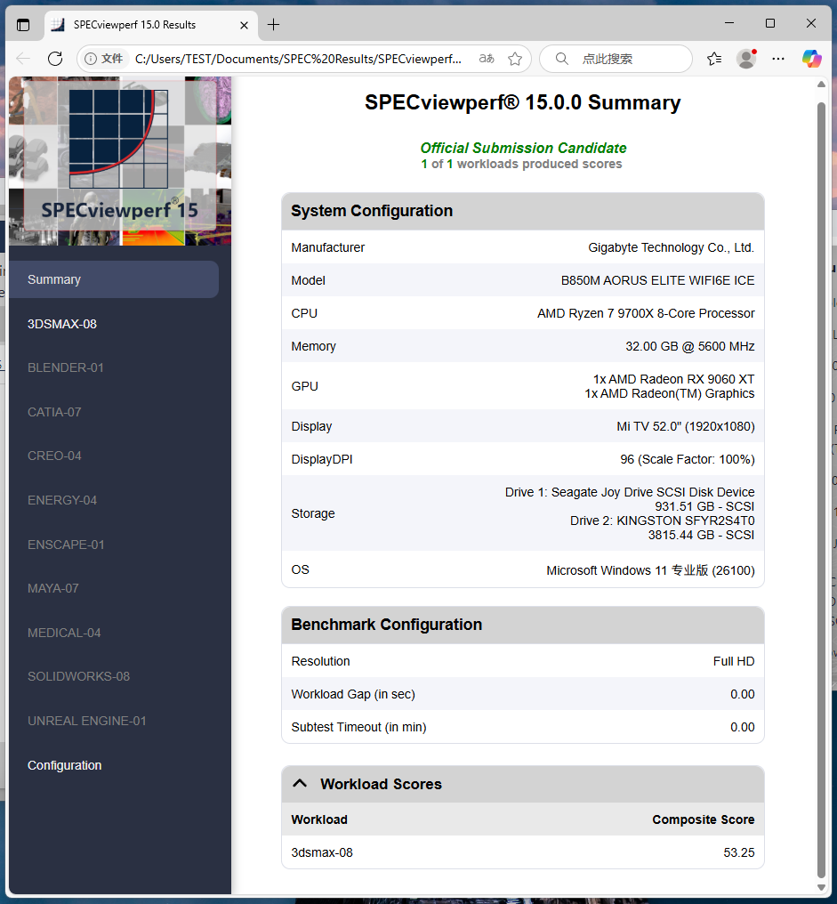 生产力方面,我们采用SPECviewperf15测试了3dsmax-08工作负载,RX 9060 XT的得分为53.25,而RTX 5060 8GB的得分只有38.95。在此方面,AMD RX 9060 XT对RTX 5060 8GB的领先优势高达36.7%,如果我们使用更高级别的AMD旗舰处理器进行测试,相信A卡对N卡的优势将会呈现倍数碾压。