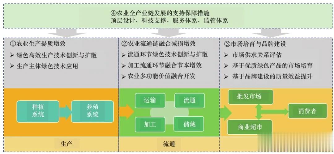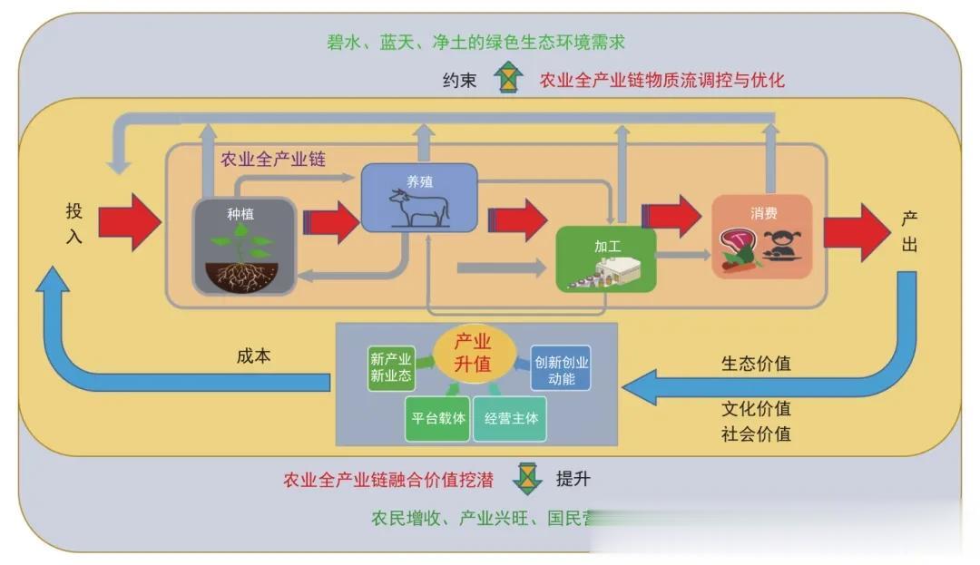 在系统边界上,农业全产业链覆盖从农田到餐桌的全部食物系统;在发展目标上,农业全产业链是绿色化、优质化、循环化、高效化的多目标协同。