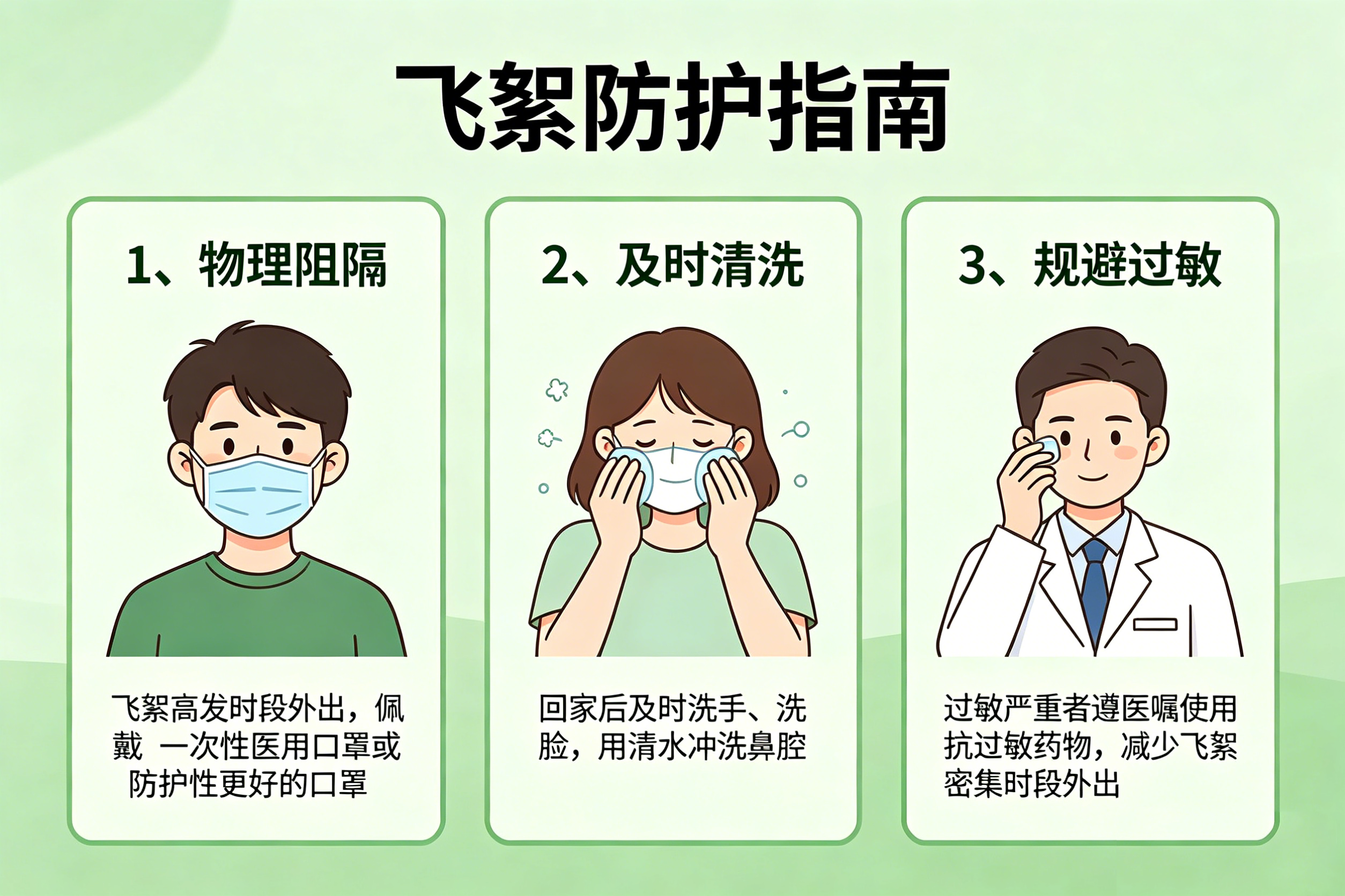 1、物理阻隔:在飞絮高发时段外出,佩戴一次性医用口罩或防护性更好的口罩,是简单有效的方法。