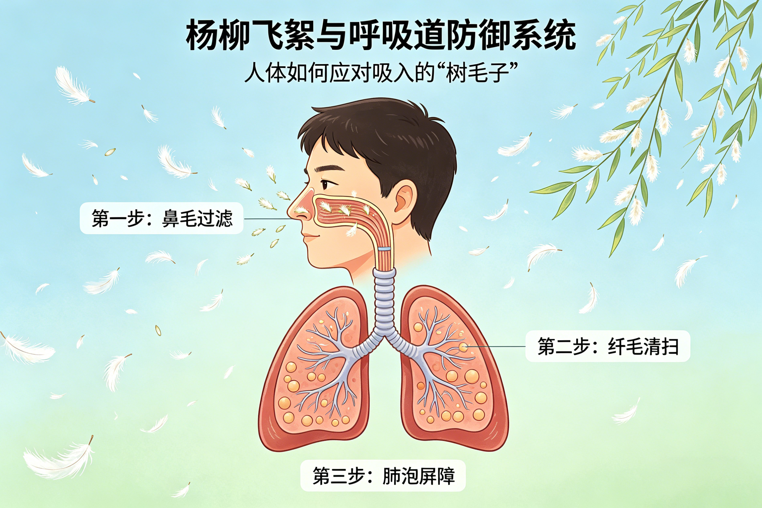 首先,鼻腔是第一道防线。鼻毛和鼻腔黏膜能拦截大部分较大飞絮和颗粒。即便少量细小的飞絮进入气管,气管和支气管内壁的纤毛会像“传送带”一样,通过规律的摆动,将异物与黏液一起向咽喉部推送,最终以咳嗽或吞咽的方式排出体外。