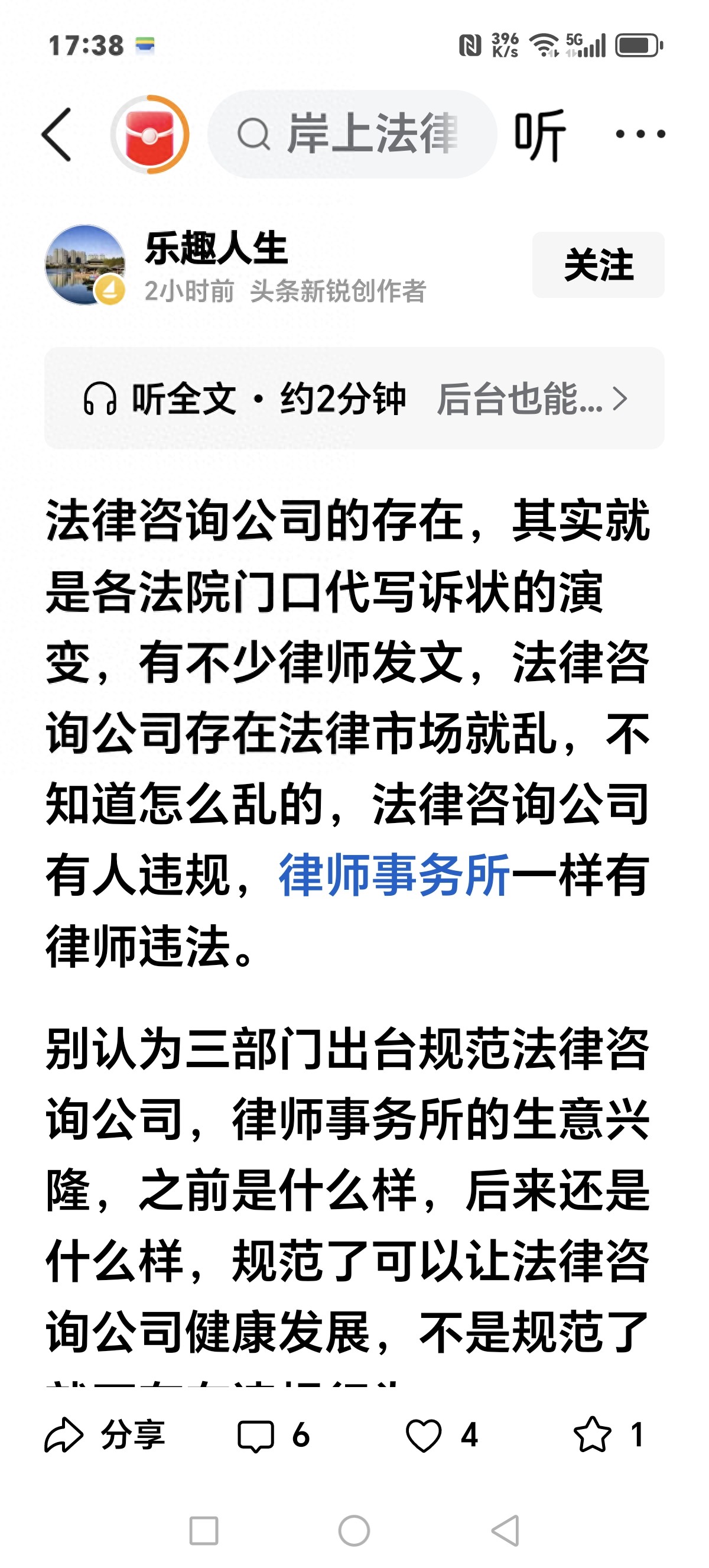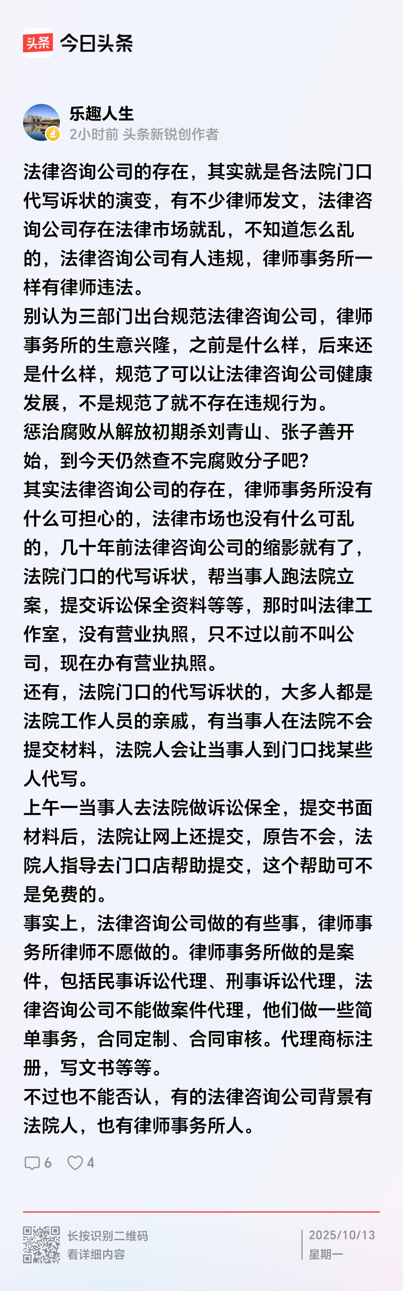 也有声音说“法律咨询公司让法律市场变乱”,可细想便知,“违规”从不是某类机构的“专属标签”。法律咨询公司里或许有少数越界者,但律师事务所中同样存在违法违规的律师,不能用个别案例否定一整个群体。就像三部门出台规范政策,核心目的从不是“打压法律咨询公司、给律所让市场”,而是让前者告别野蛮生长,在合规框架内健康发展。毕竟,规范是为了划清边界,不是为了消除某类服务——就像惩治腐败从解放初期延续至今,从未因“查不完”就停止,规范法律市场也不会因“有违规可能”就否定一种有价值的服务。