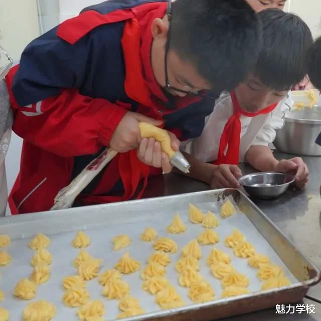同学们化身小小烘焙师,揉黄油、拌面粉、挤花嘴,一个个造型可爱的曲奇在掌心成型。