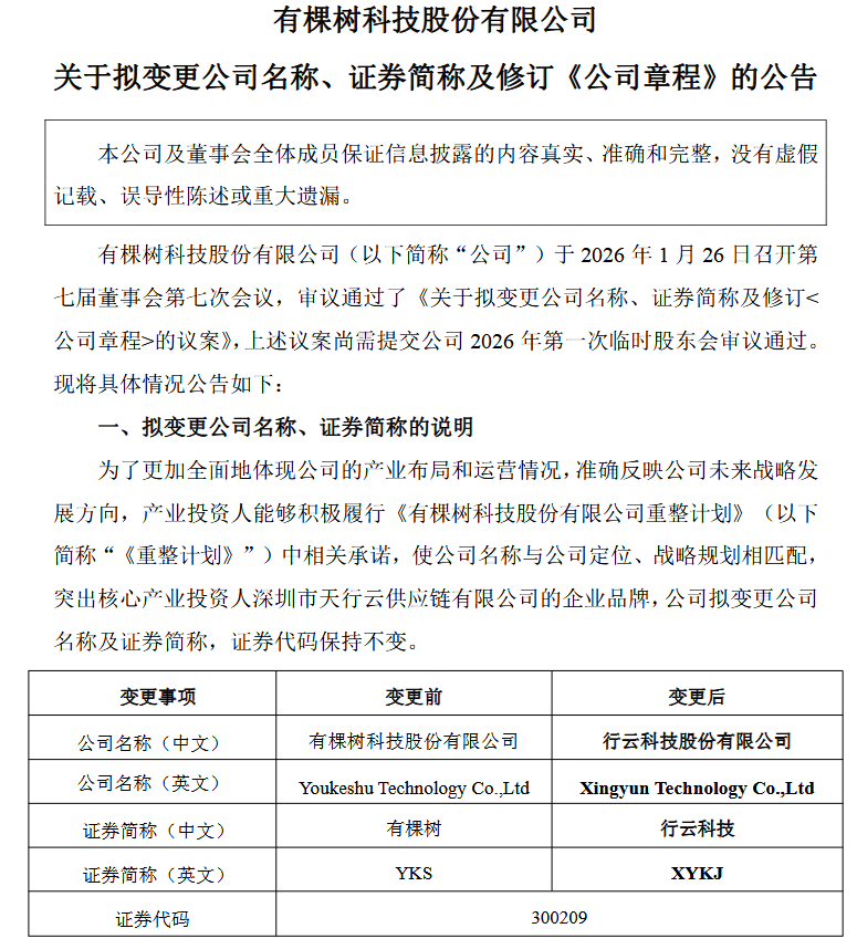 1月26日,有棵树科技股份有限公司发布公告,拟将公司名称变更为行云科技股份有限公司,证券简称同步更换为行云科技,这一更名动作背后,究竟是企业战略重构的开始,还是仅为换汤不换药的表面功夫?