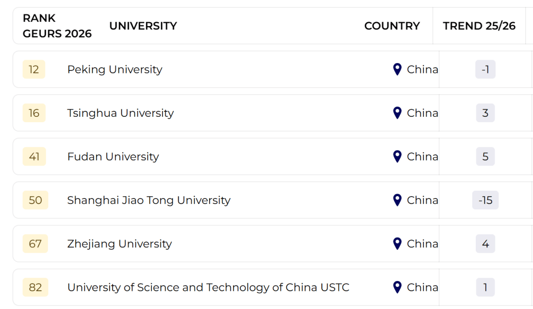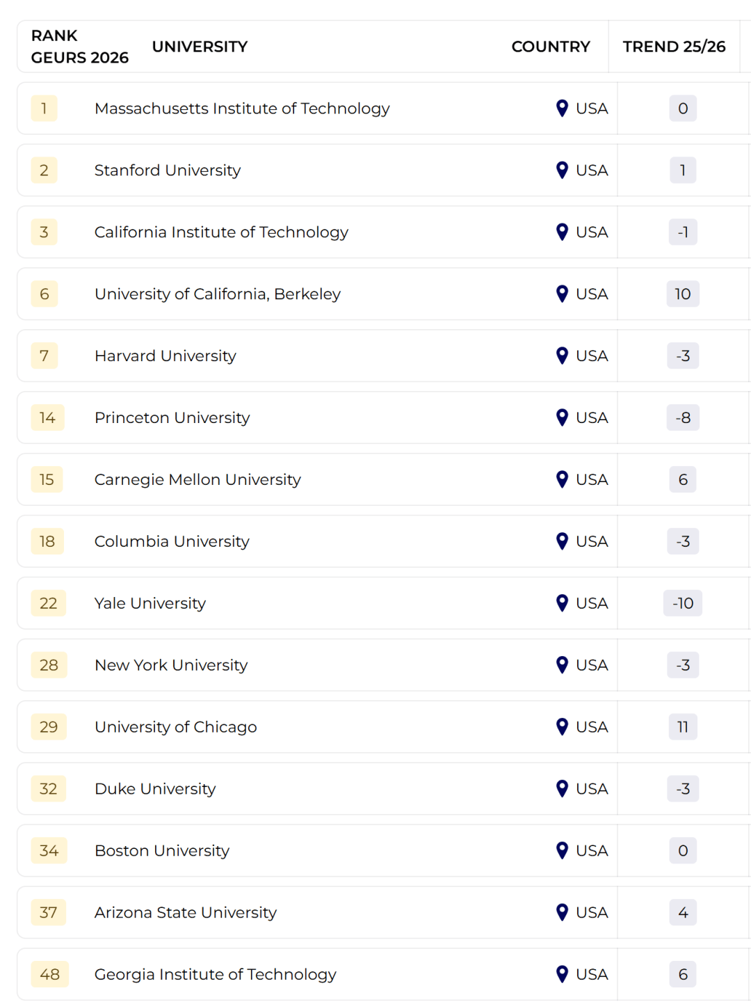 美国高校在GEURS 2026中依旧占据统治地位。麻省理工学院蝉联全球第一,展现出在科研、创新与实践结合上的卓越实力。紧随其后的是斯坦福大学和加州理工学院,稳居全球前三。此外,加州大学伯克利分校飙升10位至全球第6。