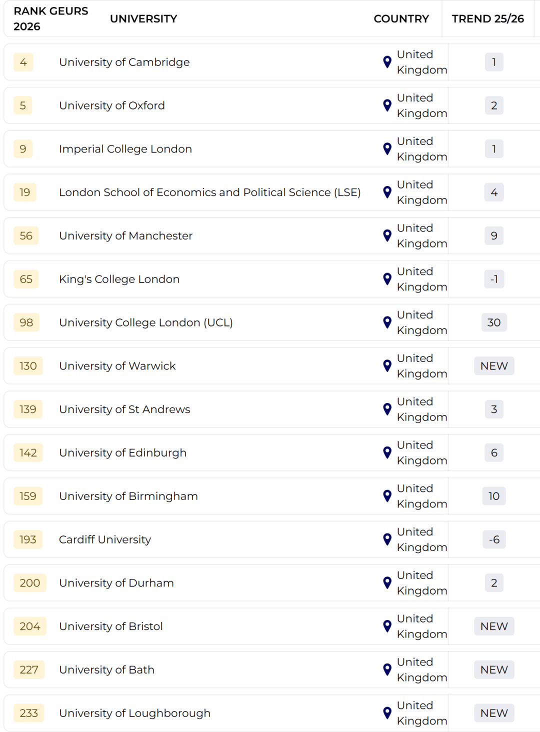 剑桥大学和牛津大学分别位列全球第4、第5;帝国理工学院和伦敦政治经济学院(LSE)稳居前20。