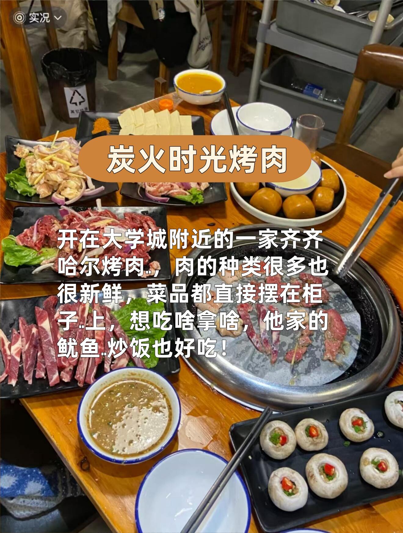 开在大学城附近的一家齐齐哈尔烤肉🍖,肉的种类很多也很新鲜,菜品都直接摆在柜子🗄️上,想吃啥拿啥,他家的鱿鱼🦑炒饭也好吃!