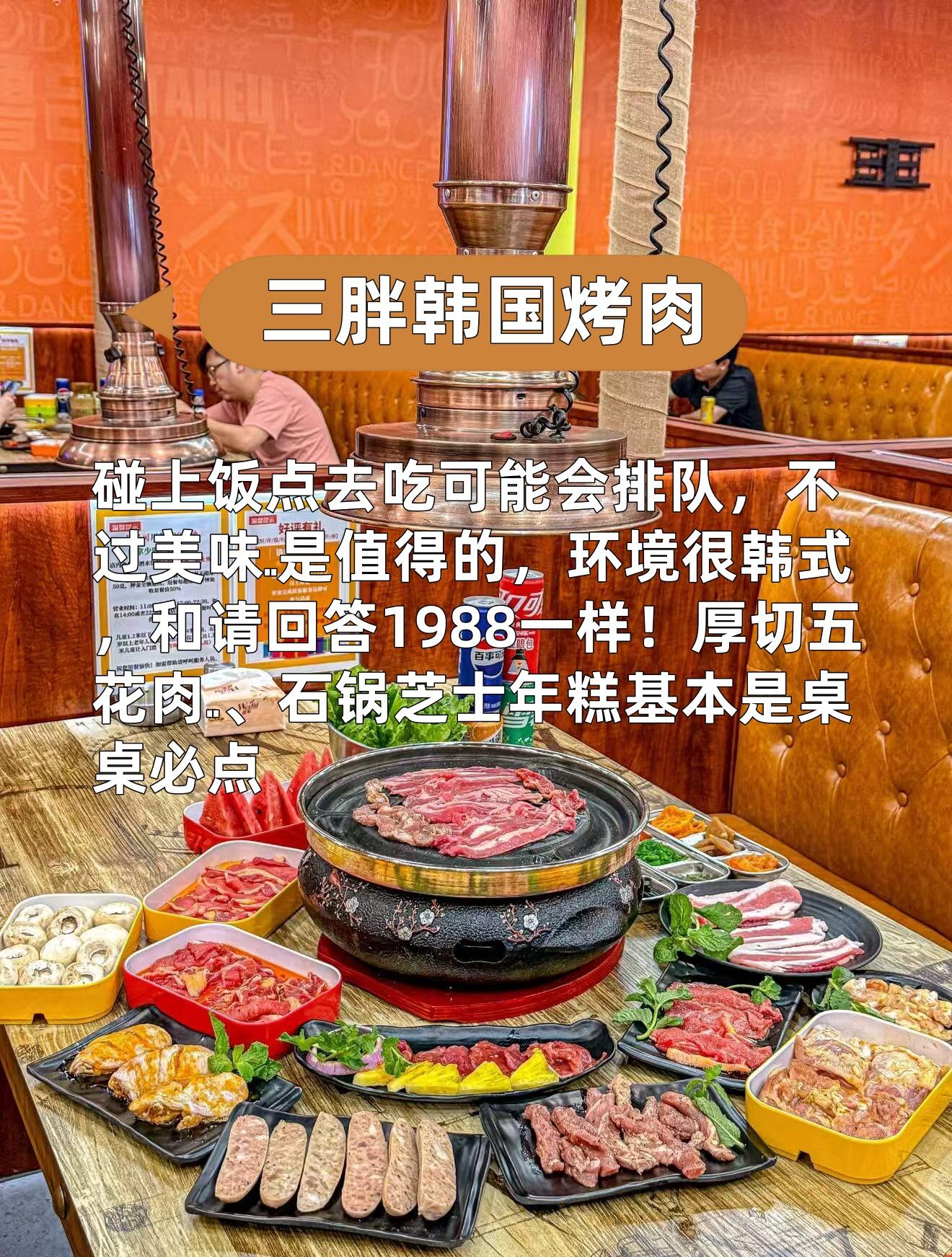 ✅ 三胖韩国烤肉:碰上饭点去吃可能会排队,不过美味😋是值得的,环境很韩式,和请回答1988一样!厚切五花肉🥩、石锅芝士年糕基本是桌桌必点