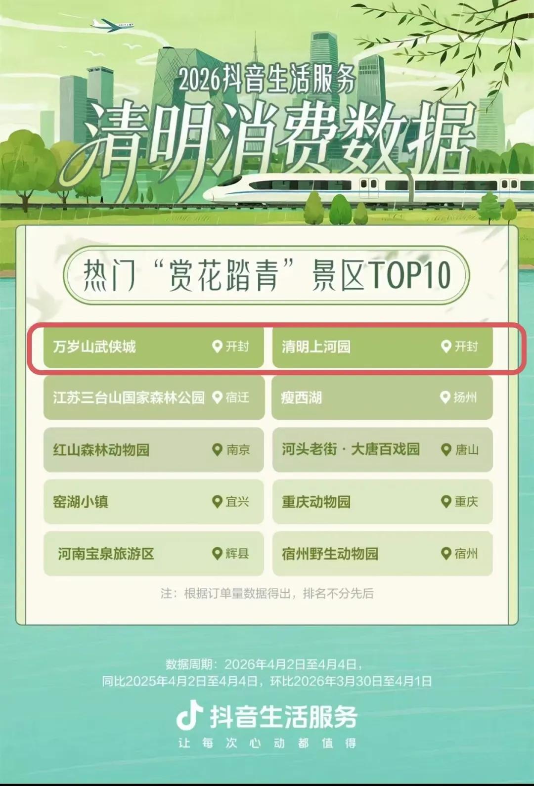 抖音生活服务:清明假期期间,恰逢多地春假,“赏花踏青”需求持续走高,徐州、开封、无锡等成为10大热门非一线春游城市。开封万岁山武侠城、开封清明上河园等入围“10大热门赏花踏青景点”。#宋韵开封 #汉服游开封 #夜游开封# 等话题热度飙升,成为年轻人打卡的热门选择。