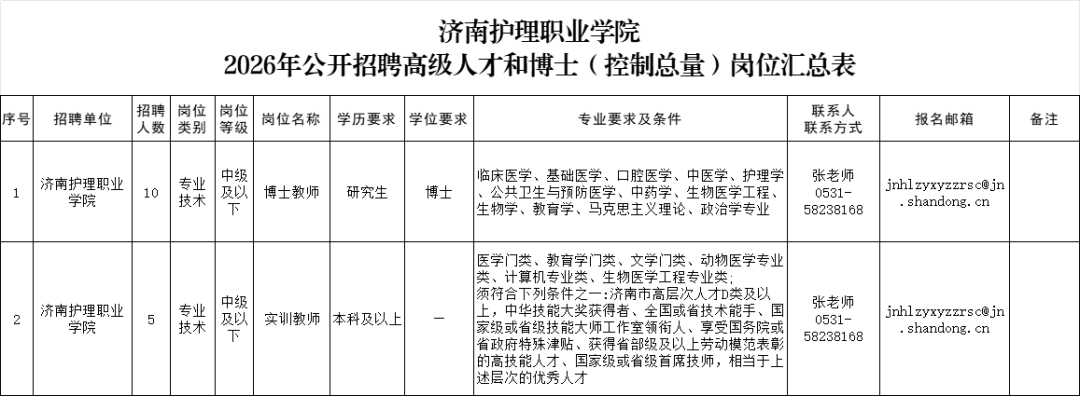 2026年公开招聘高级人才和博士(控制总量)公告已在济南护理职业学院网站(https://www.sdjnwx.com/articles/3671)发布。招聘后续相关事宜请持续关注学院官网。