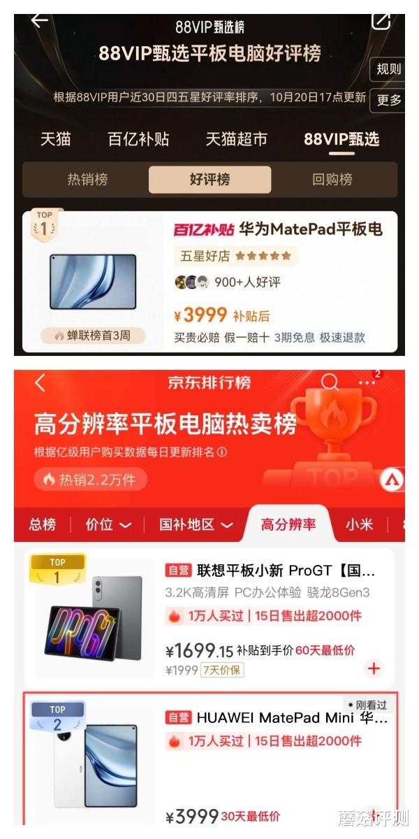 其实,我们观察到,华为MatePad Mini实打实地赢得了销量和口碑的双丰收。其线上数据尤为亮眼,在“88VIP甄选平板电脑好评榜”上,它稳居TOP 1;在竞争激烈的“京东高分辨率平板电脑热卖榜”中,也迅速冲上了TOP 2。
