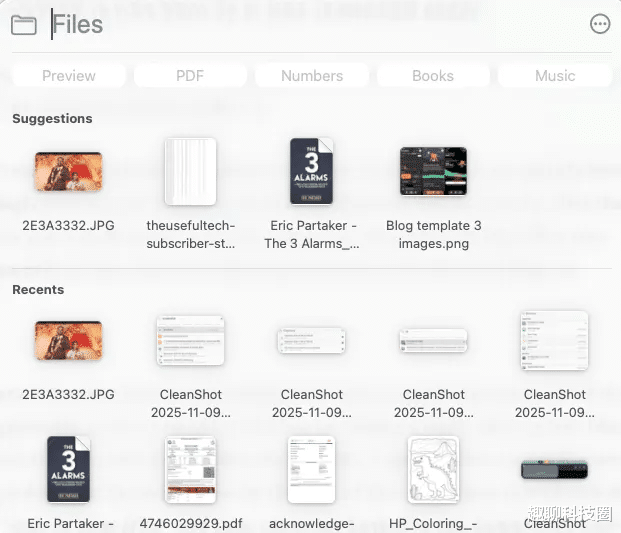 现在按 ⌘ + 2 可以进到 Files 浏览视图,Spotlight 会根据你过往的使用习惯、常开的文件和当前处理的文件,智能推荐你可能要找的那些文件,像我的日常更新表、项目跟踪文档那些经常要用的东西,现在几下就能拿到,不用再在下载堆里翻半天。