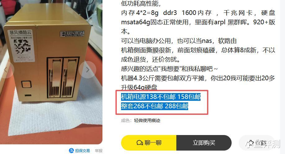 单机箱电源138元不包邮,158元包邮。整套带主板CPU内存和64G固态,268元不包邮,288元包邮。运费双方平摊,卖家出二十多,买家出二十。说实话,这个价格已经不能用性价比来形容了,简直就是白送。你想想,现在随便买个铝合金双盘位机箱多少钱?光这个机箱二手都能卖一百多,剩下CPU主板内存固态硬盘全是送的。