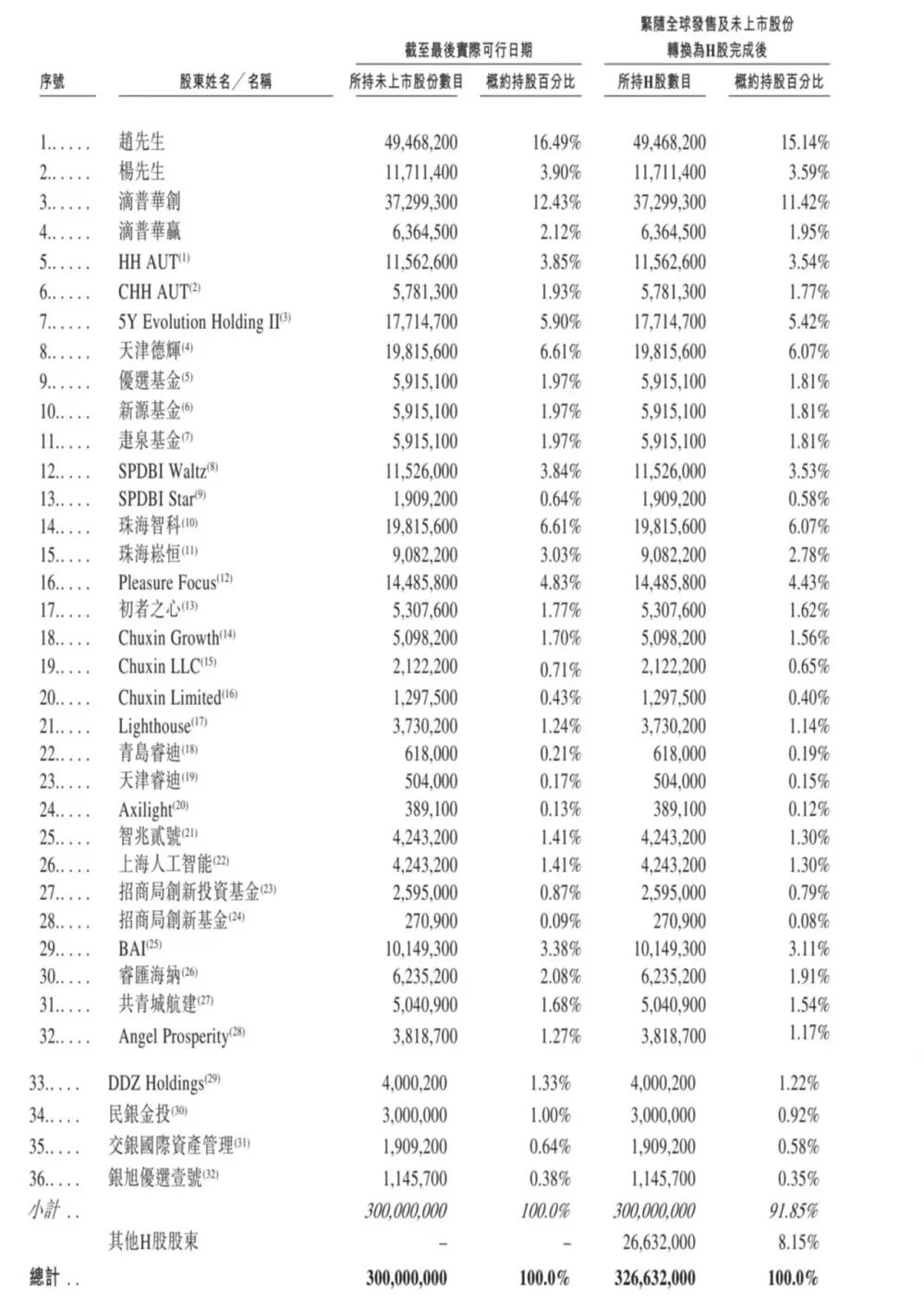 滴普科技的股东阵容豪华,包括高瓴资本(通过珠海智科持股约6.61%)、五源资本(持股5.9%)、IDG资本(通过Pleasure Focus持股4.83%)、上海人工智能产业投资基金(持股1.41%)、招商局(持股0.96%)等。