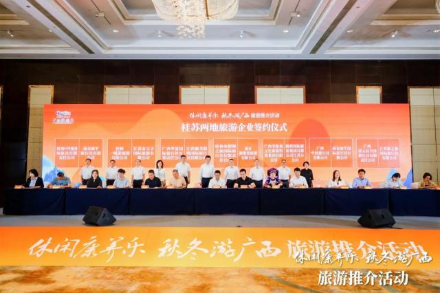 此次推介活动吸引了100多家桂苏两地旅游企业进行深度交流,并开展桂苏两地文旅企业产品对接会,达成多项合作。活动现场,桂林中国国际旅行社有限责任公司、桂林一城游旅游有限公司、广西华夏国际旅行社有限责任公司、桂林市假期之旅国际旅行社有限责任公司、广西零距离文化旅游投资集团有限公司、广西中国旅行社有限公司、广西凌云县兴凌旅行社有限责任公司等7家广西旅游企业与多家江苏旅游企业成功签约。未来,双方将依托“客源互送、线路共推、政策互惠”机制,为跨省游注入新动能,推动从“资源共享”向“市场共建”升级,为江苏省及长三角地区游客提供更加多样化的秋冬季旅游选择。