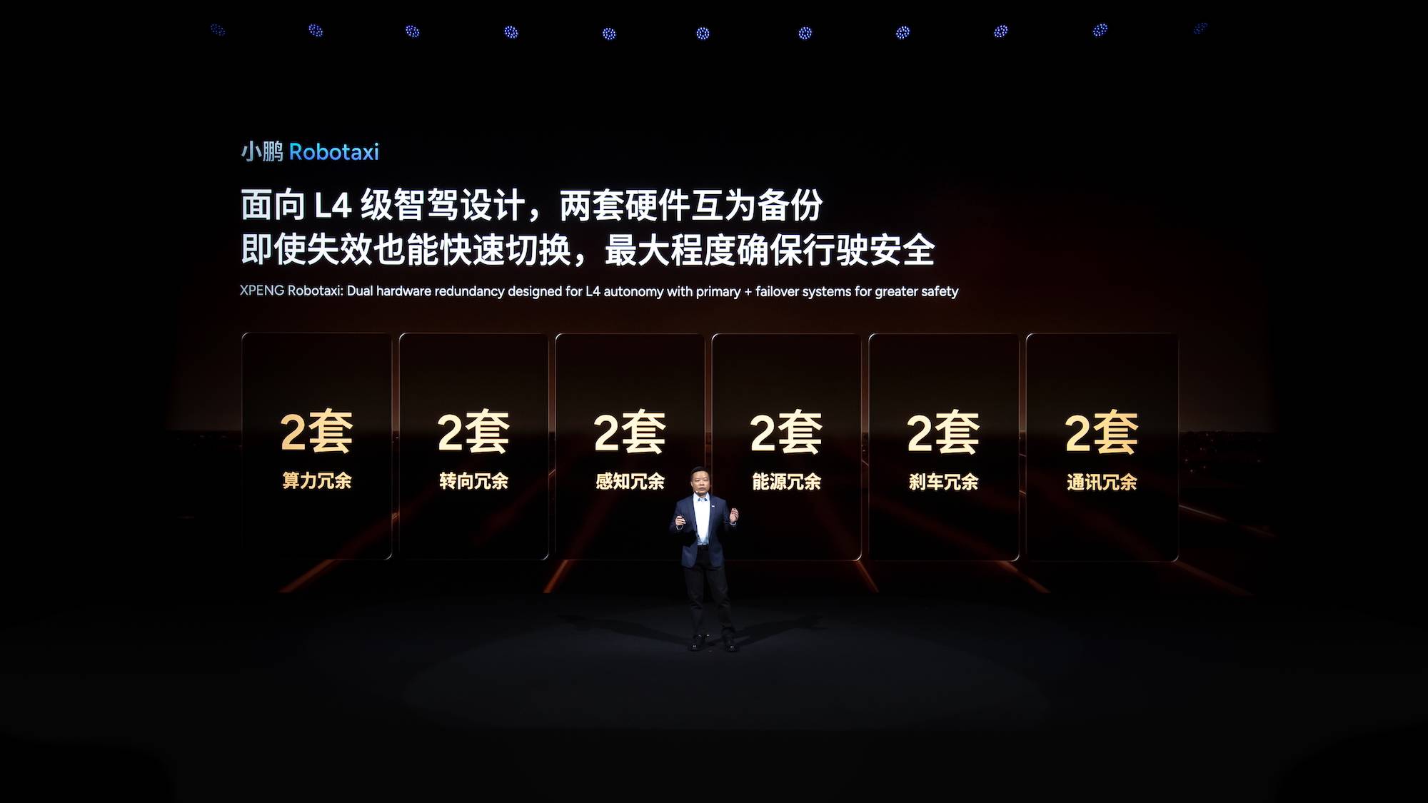 届时的小鹏Robotaxi首先从算力、转向、感知、能源、刹车、通讯等全都采用两套硬件互为备份,全面冗余;并搭载4颗图灵AI芯片,车端算力高达3,000TOPS,且不依赖激光雷达与高精地图,依托纯视觉方案即可应对全球不同道路类型及交通环境。